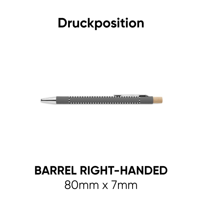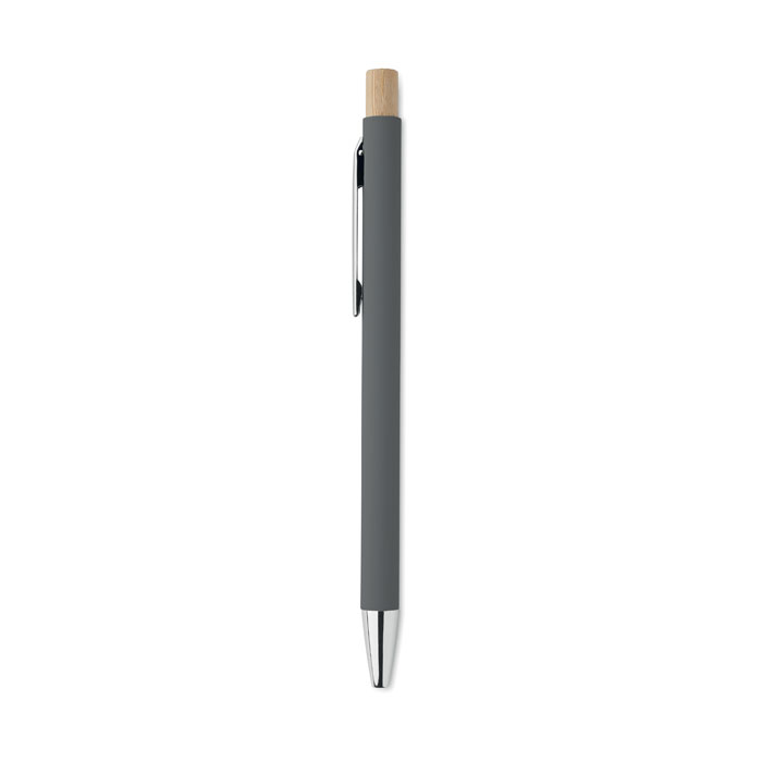 Druckkugelschreiber aus recyceltem Aluminium mit Druckknopf aus Bambus. Silberne Spitze und Clip. Blaue Tinte.