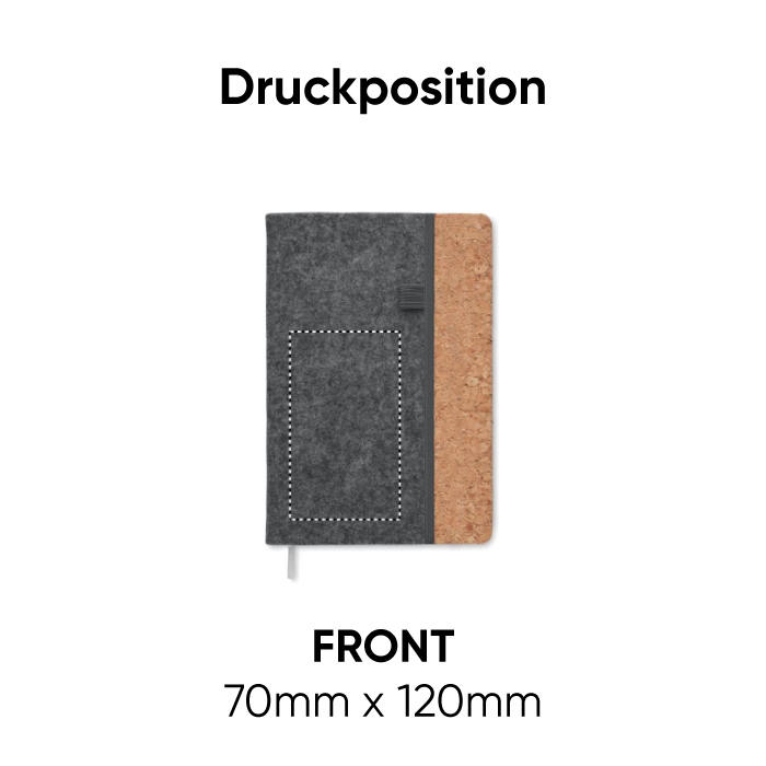 DIN A5 Notizbuch mit Cover aus RPET-Filz und Kork. 80 Blatt (160 Seiten) liniertes Recyclingpapier. Elastisches Verschlussband, Lesebändchen und Stiftschlaufe. FSC MIX 100% | P7.1 | FSC-C213206