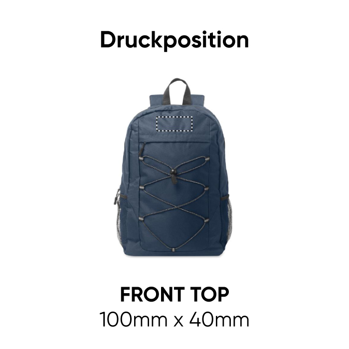 Rucksack mit Schnürung. Fronttasche mit Reißverschluss. Netztaschen auf beiden Seiten. 600D RPET-Polyester.