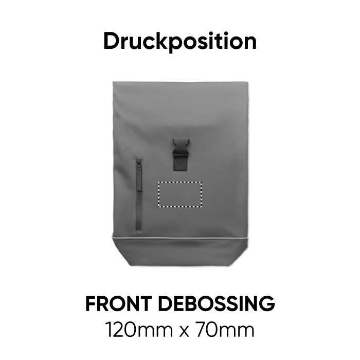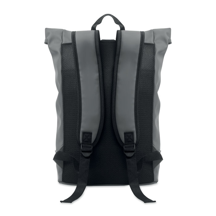 15“ Rolltop-Laptop-Rucksack aus weichem PU. Gepolsterter Rücken und verstärkter Boden mit reflektierenden Streifen. Wasserabweisende Fronttasche mit Reißverschluss. Futter aus 210D RPET-Polyester.