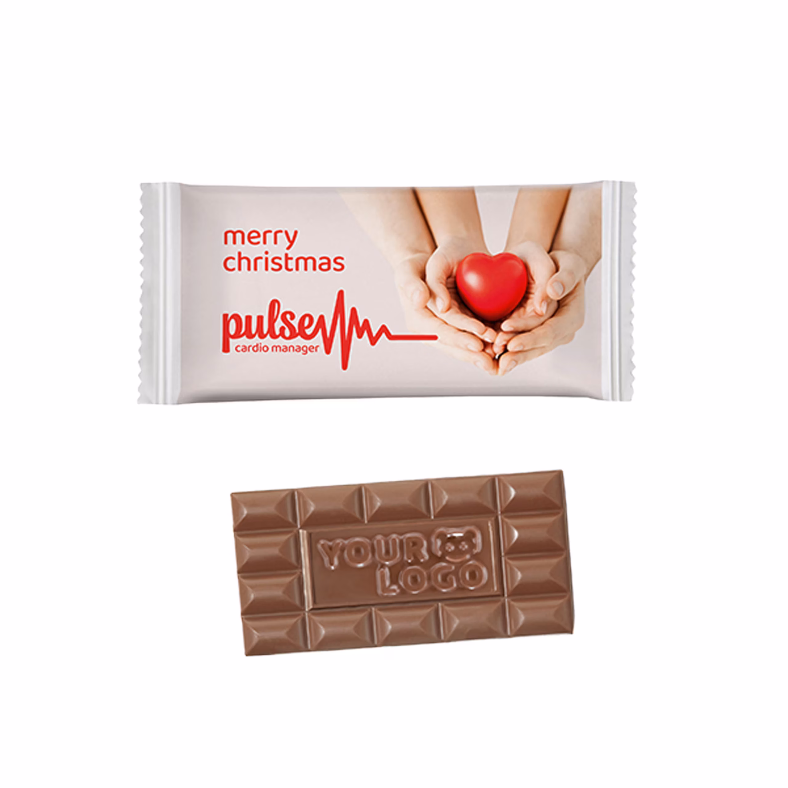 Midi-Logo-Schokoladenriegel in einer standardmäßigen weißen Flowpack-Verpackung, ca. 25 Gramm