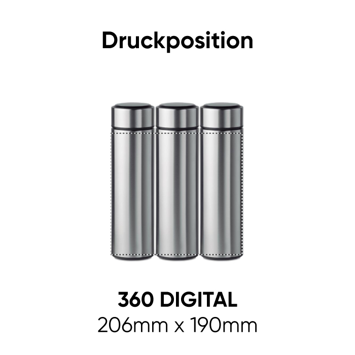 Doppelwandige Isolierkanne aus Edelstahl. Mit Tee-Sieb. Im Deckel befindet sich eine integrierte Touchscreen LED Temperaturanzeige, die die Temperatur des Getränks anzeigt. Inkl. 1 austauschbare CR2032. Batterie. Füllmenge: 450 ml. Auslaufsicher.