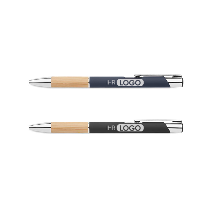 Druckkugelschreiber. Aluminium mit Griffteil aus Bambus. Blaue Tinte.