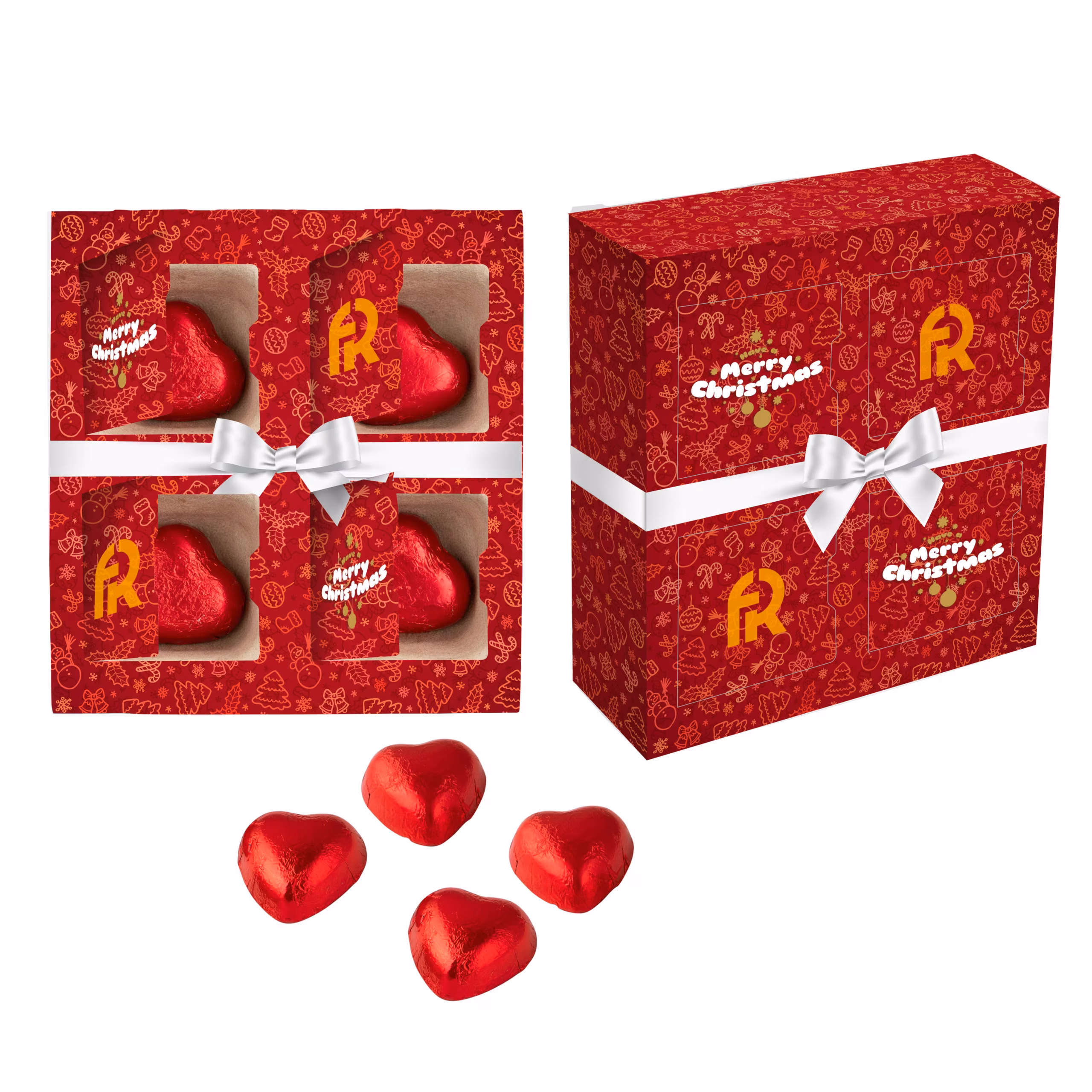 Überraschungsbox mit 4 Fächern, vollfarbig bedruckt, gefüllt mit 4 Schokoladenherzen in roter Folie.