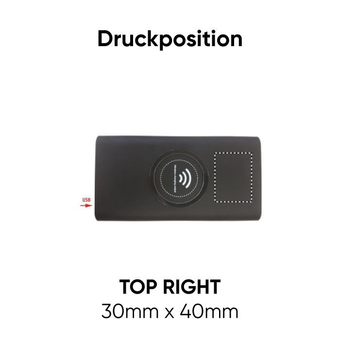 Kabellose Powerbank 8000 mAh. Durch Auflegen Ihres Smartphones, oder mit Kabel, startet der Ladevorgang. Inkl. Typ C Anschluss. ABS mit gummiertem Finish. Powerbank-Ausgang DC5V/2,1A. Kabelloser Ausgang: DC5V/1A. Kabelloser Empfang: DC5V/0.75A.