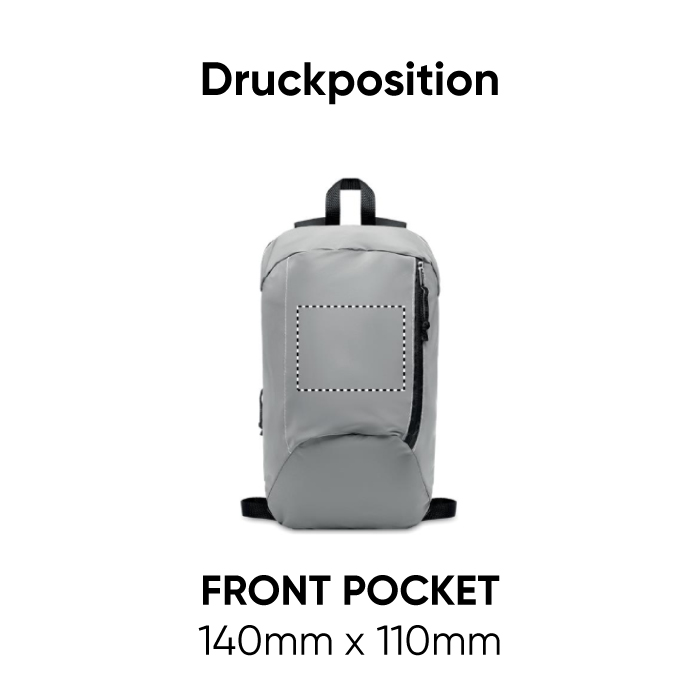 Rucksack mit Front aus hoch reflektierendem Polyester. Fronttasche mit Reißverschluss. Gepolsterte Rückseite. 600D Polyester.